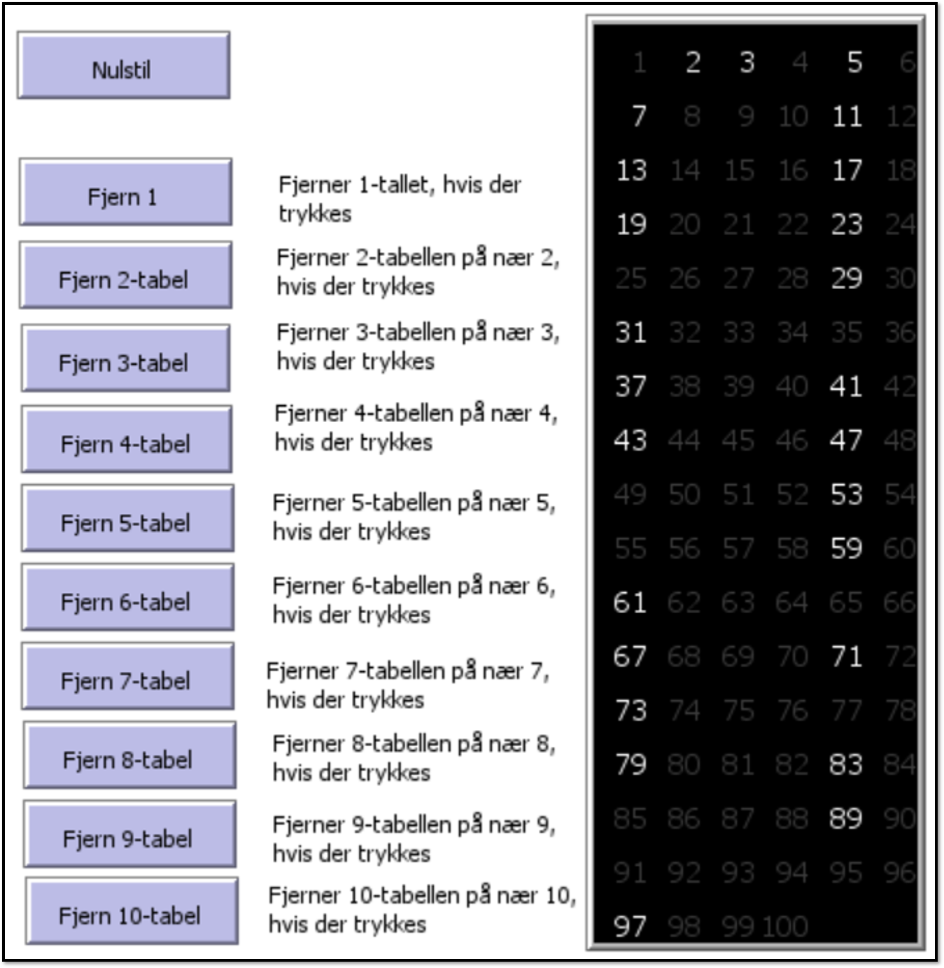 Ovenfor har man fundet primtallene op til 100 ved at fjerne tabellerne op til √100 = 10.